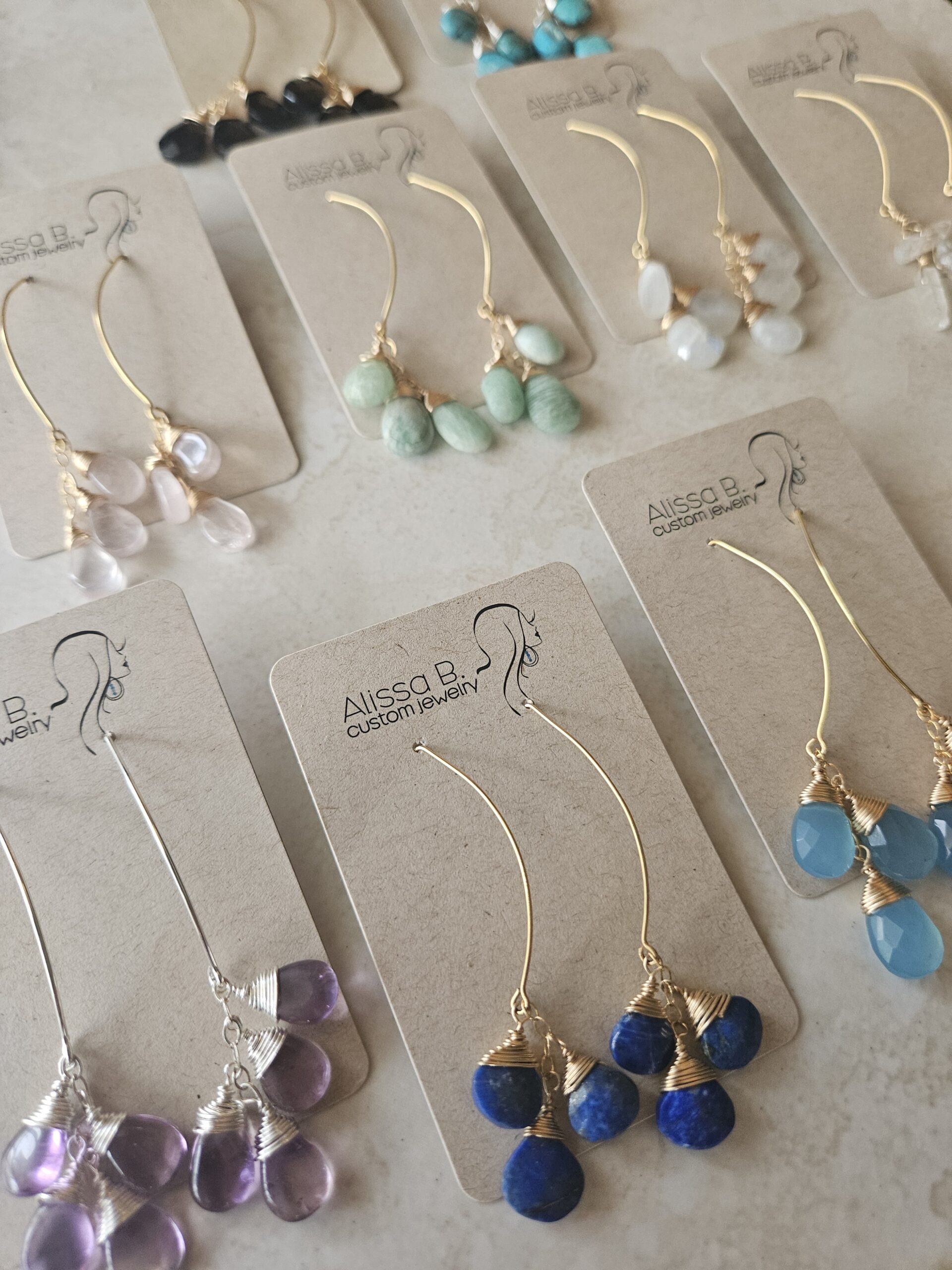 | gemstone | amazonite, green onyx, labradorite, moonstone, rose quartz, lapis, turquoise, smoky quartz |